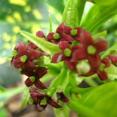 A large leathery leaved evergreen shrub with yellow spotted and speckled variegated leaves. The leaf markings of this cultivar are noticeably variable in size, from large blotches to tiny specks. Flowers are small and purple and are followed by bright red berries when pollinated. Aucuba japonica Crotonifolia is a good tough shrub for difficult spots and tolerates dry shade and salt air. Grows well in a container. Female, requires a male pollinator for berries.