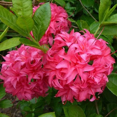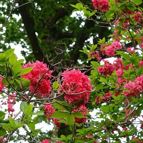 Despite its rather domestic name, Rhododendron Homebush is a really stunning Exbury azalea with glorious deep pink flowers. It’s a compact, bushy, medium-sized deciduous shrub, lovely for a woodland planting or a small or courtyard garden with acid soil. The large, oblong leaves are deep green, turning reddish-purple in autumn. In May, dense clusters of semi-double funnel-shaped rose-pink flowers are borne on the bush. Mulch well in spring to conserve moisture round the rather shallow roots. Azalea Homebush holds the RHS Award of Garden Merit.
