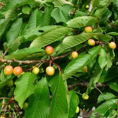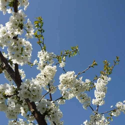 An outstanding early variety of ‘white’ cherry, sweet, Cherry Merton Glory was bred in England in the early 20th century. The fruit is large, heart-shaped, pale yellow flushed red, with sweet, white flesh and a good, sweet flavour. Compact, upright tree, heavy, regular cropper. Will crop best trained against a warm wall, so the fruit can be protected against birds. Can also be grown in a pot. Prune as little as possible, and only in summer. Pollination partners Early Rivers, Noir de Gubin, Morello, Sunburst, Stella.