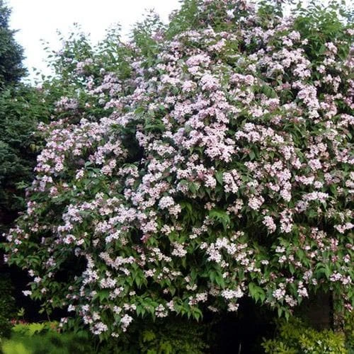 A choice, quite rare plant from the honeysuckle family, Dipelta yunnanensis is a large, deciduous shrub with arching branches and attractive pale brown, peeling bark, looking rather like a weigela. Elliptical, glossy, mid-green leaves are 5” (12cm) long. Small clusters of scented, white, funnel-shaped flowers, 1” (2.5cm) long, with a pink flush and orange markings in the throat, appear in April and May. Conspicuous pinkish-green bracts surround the little fruits. Yunnan honeysuckle comes from Western China.