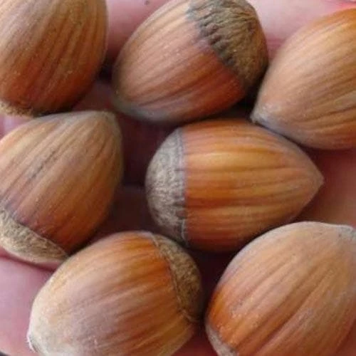 This old, late-season variety of cultivated hazel, Corylus avellana ‘Hall’s Giant’, also known as Merveille de Bollwiller, originated in France, and despite its name, grows as quite a compact bush. It was named for the size of the nuts, although these are a bit smaller than those of some modern varieties. Very vigorous and exceptionally reliable, bearing heavy crops of large, rather pointed, glossy brown nuts with an excellent flavour, whether eaten fresh or from store. Highly nutritious source of high-quality protein, ‘good fats’, fibre, Vitamin B, folate, iron and other minerals. Harvest as they start falling from the tree. Eat fresh, or dry the crop carefully, then remove the husks and store in a mouse-proof place. Filbert ‘Hall’s Giant’ was the best performer in trials by the Agroforestry Research Trust in Devon. A good choice where weather conditions are poor, and an excellent pollinator of other later-flowering hazels. Attractive catkins with a red tinge in late winter.