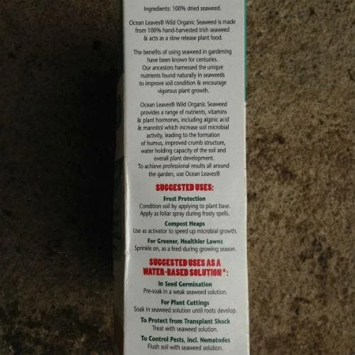 Ocean Leaves Wild Organic Seaweed is made from 100% hand-harvested Irish seaweed and acts as a slow release plant food, providing a range of nutrients, vitamins and plant hormones, including algiric acid and mannitol which increase soil microbial activity, leading to the formation of humus, improved crumb structure, water holding capacity of the soil and overall plant development. Use: