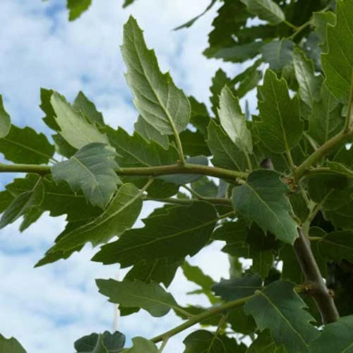 A chance hybrid seedling between Quercus cerris and Q. wizlizenii found at Kew Gardens in 1914, Quercus x kewensis is a large, evergreen tree with a fairly open, spreading, oval, later rounded, crown. The young twigs are light brown and downy, but later the bark becomes smooth and grey, eventually becoming almost black and deeply ridged. The leaves have shallow, almost triangular lobes and are matte deep green above with shinier, paler undersides, giving a lighter, mobile effect when stirred by a breeze. Unobtrusive catkins in May are followed by large, oval acorns in autumn; these usually fall before fully ripe. Kew Oak cannot tolerate cold, drying winds. A good specimen or park tree.
