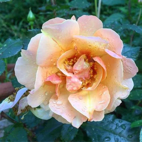 A very pretty, often diminutive, hybrid of Rosa persica with the characteristic persica dark eye, Rosa persica Persian Sun is a small, deciduous, repeat-flowering shrub rose with a compact, dome-shaped habit and glossy, grey-green foliage. From June to October, the plant bears flushes of semi-double, peach-coloured flowers with a deeper eye and golden-yellow stamens; the innermost petals are shorter, giving a very pretty, rather anemone-like effect, and the fragrance is light. Shrub rose Persian Sun is a tough, very healthy rose, and tolerates drought once established. It’s perfect in soil-based compost in a large container, or at the front of a sunny border. Easy to grow and disease-resistant.