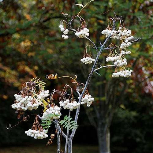 A beautiful rowan from the Himalayas, Sorbus cashmiriana is a small, spreading deciduous tree or large shrub. Corymbs of scented, pale pink flowers, larger than those of other rowans, appear in spring, followed in late summer by clusters of big white berries, ½”/12mm wide and pink-tinged at first, hanging from crimson stems. The berries hold on the tree well, sometimes right through the winter. The leaves are green and divided like the native rowan’s, but show little autumn colour. The Kashmir rowan is good for pollinators and birds, and a lovely specimen tree for the small garden. It holds the RHS Award of Garden Merit.