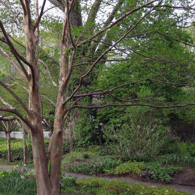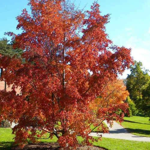 A camellia relative, Stewartia pseudocamellia var. Koreana is a large, slow-growing, deciduous shrub or small tree, with a spreading, open habit and grey bark peeling decoratively to reveal orange, purplish and cinnamon-coloured inner bark. The ovate leaves are deep green, turning bright orange and red in autumn. Single, pure-white, camellia-like flowers, over 2”/5cm across, with a prominent boss of golden-yellow stamens are borne over a six-week period in midsummer; these are a valuable nectar source. Korean stewartia is a beautiful specimen shrub or tree, with year-round interest, if given the right conditions. It dislikes disturbance, so plant it in the right spot first time.