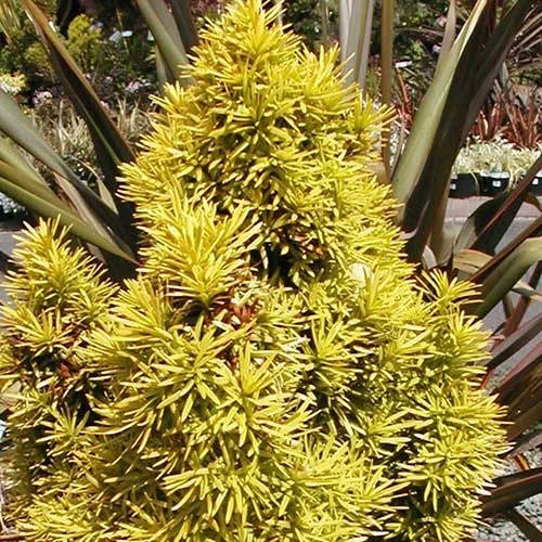 A dwarf, columnar, golden cultivar of the common yew, Taxus baccata Standishii is a small, very slow-growing evergreen shrub with an upright, narrow habit and very erect branches rising from the base. The rich yellow, narrow, pointed leaves bring a splash of light into shady areas, although the colour is richest in full sun. Insignificant yellow flowers are followed by light red yew-berries. Good as a feature shrub in a very small garden or courtyard, or as a rockery plant. It tolerates clipping well, should it eventually succumb to middle-aged spread. Be aware that the plant is toxic to livestock. Standish yew holds the RHS Award of Garden Merit.
