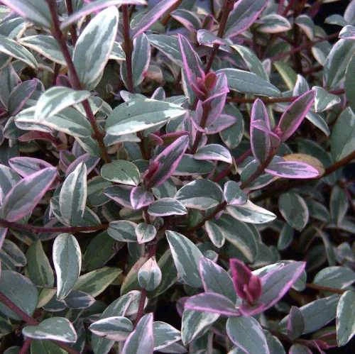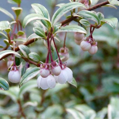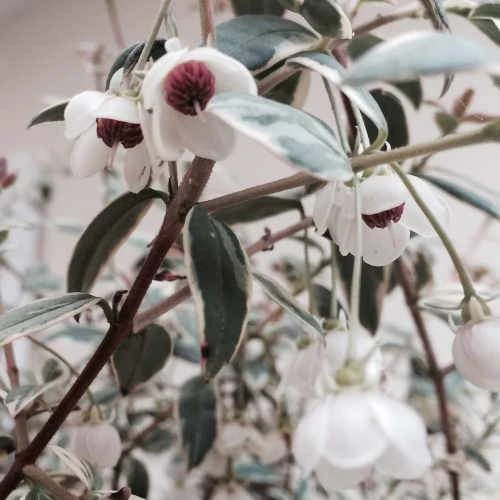 A cultivar of what was once called Myrtus ugni, Ugni molinae Flambeau is a medium-sized, slow-growing, evergreen shrub with an open habit and edible berries. Elliptical to oval, glossy green leaves are attractively variegated with pink and cream margins, giving rise to its name of Flambeau or Torch. In summer, pink and white flowers like nodding bells appear, followed by aromatic, deep pink edible berries, with a delicious flavour. An easy, attractive and productive plant.